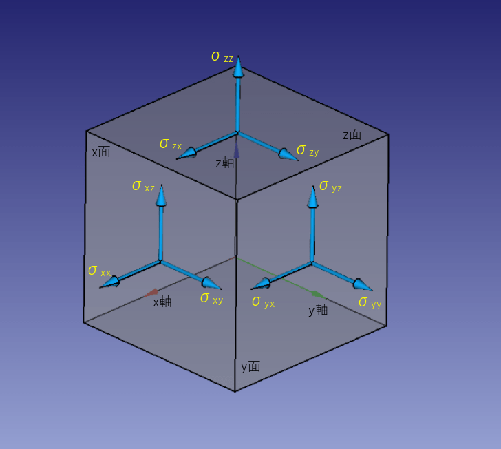 ・x面に関し:σxx x方向への垂直応力、σxy y方向へのせん断力、σxz z方向へのせん断力