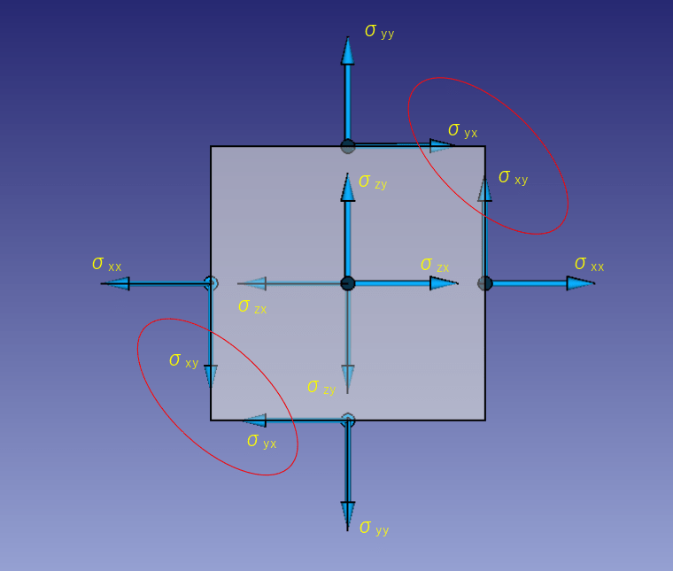 ・y面に関し:σyx x方向へのせん断力、σyy y方向への垂直応力、σyz z方向へのせん断力