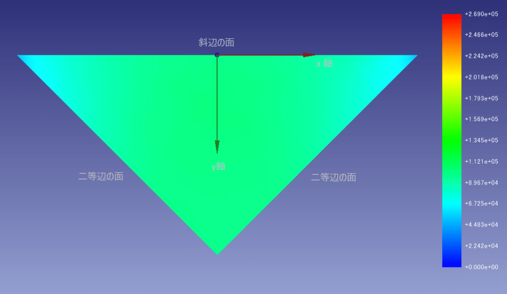これ以降、三角形の斜辺における応力を議論しますが、FreeCADにおける応力はあくまで上述6個となります(物体の斜面でも上述6応力となり、斜面に沿った応力ではない点を注意する必要があります)。