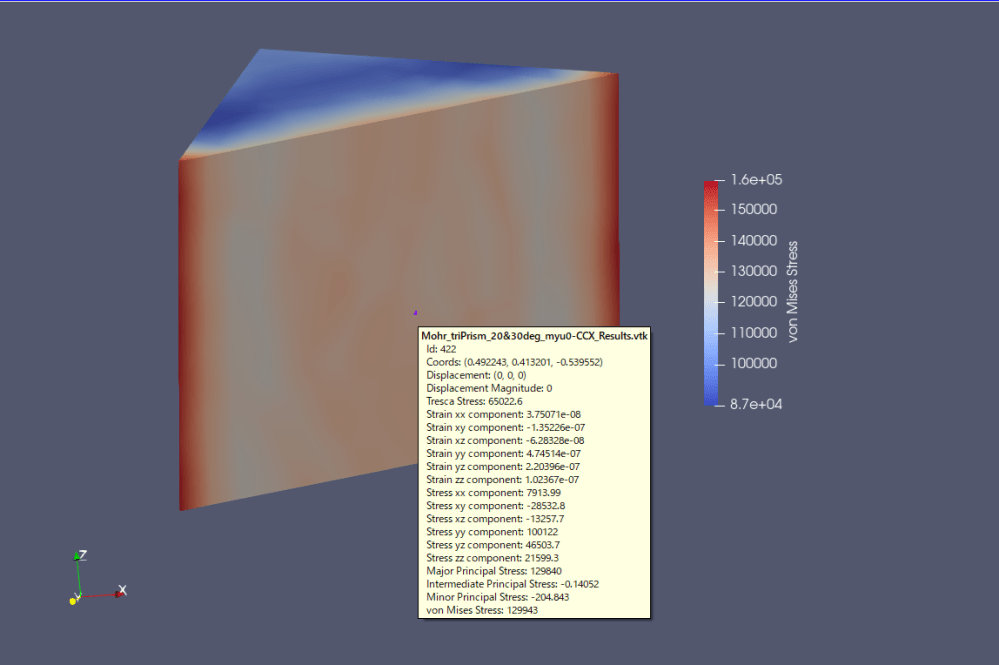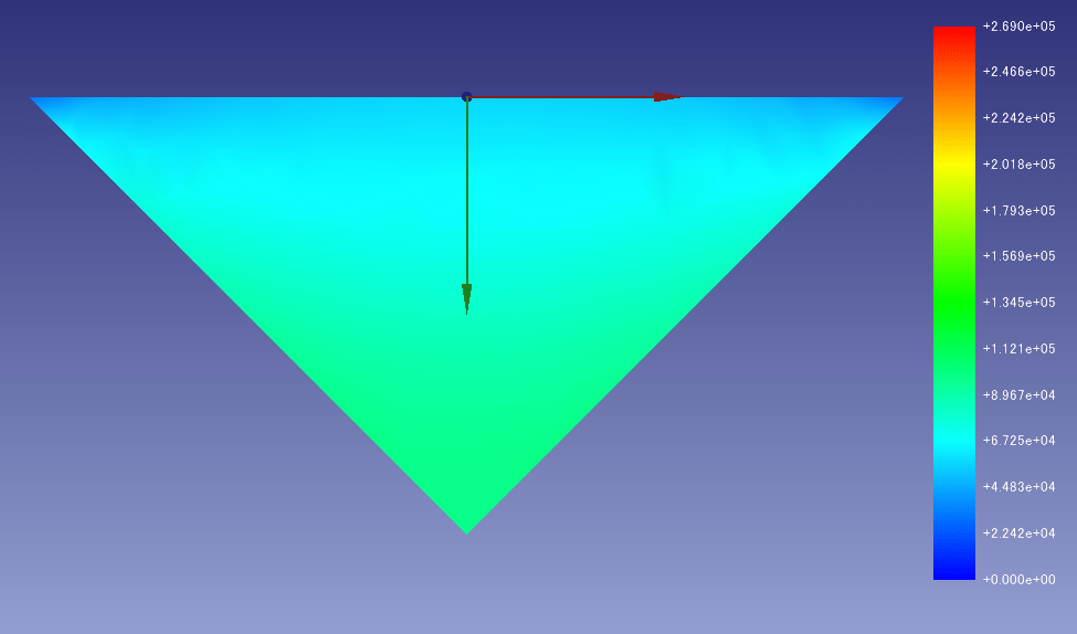 FreeCADの計算結果をParaviewに移行して斜辺中央辺りの数値を読み取ってみます。