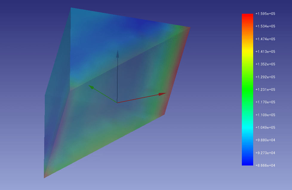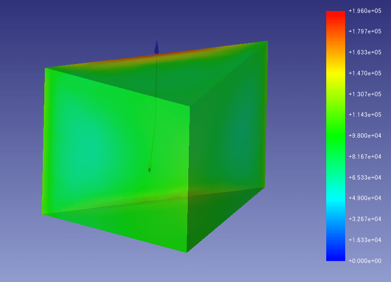 FreeCADでは変形を考慮するため、斜面の縁に応力が集中しています。印加応力が100kPaに対し、縁では200kPaに達しているようです。しかしそれはあくまで局部的であり、全般的には100kPaとなっています。