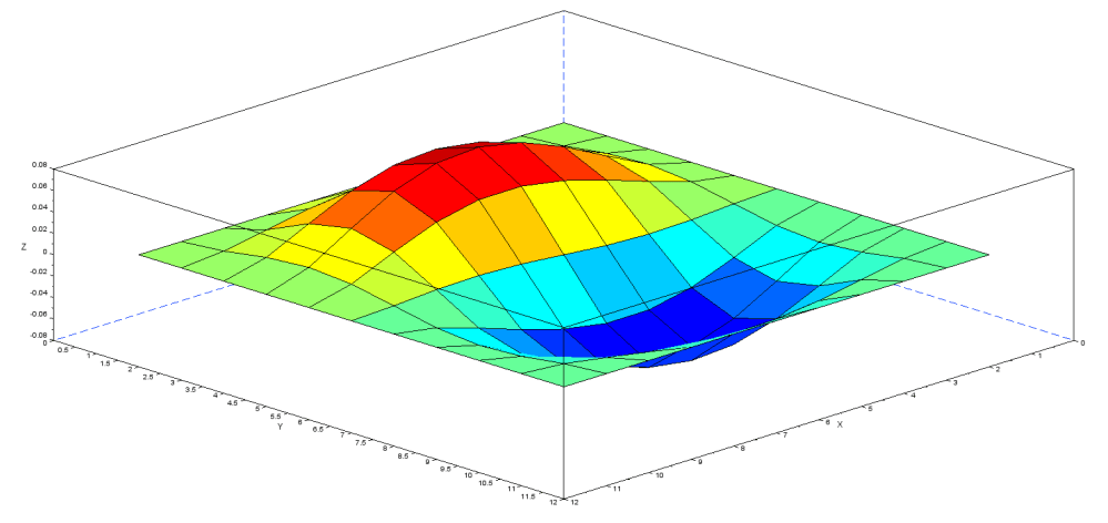 Scilabの項では500x500x0.5mmを10x10マスに分割し、2Dでの固有値解析を実施しました。