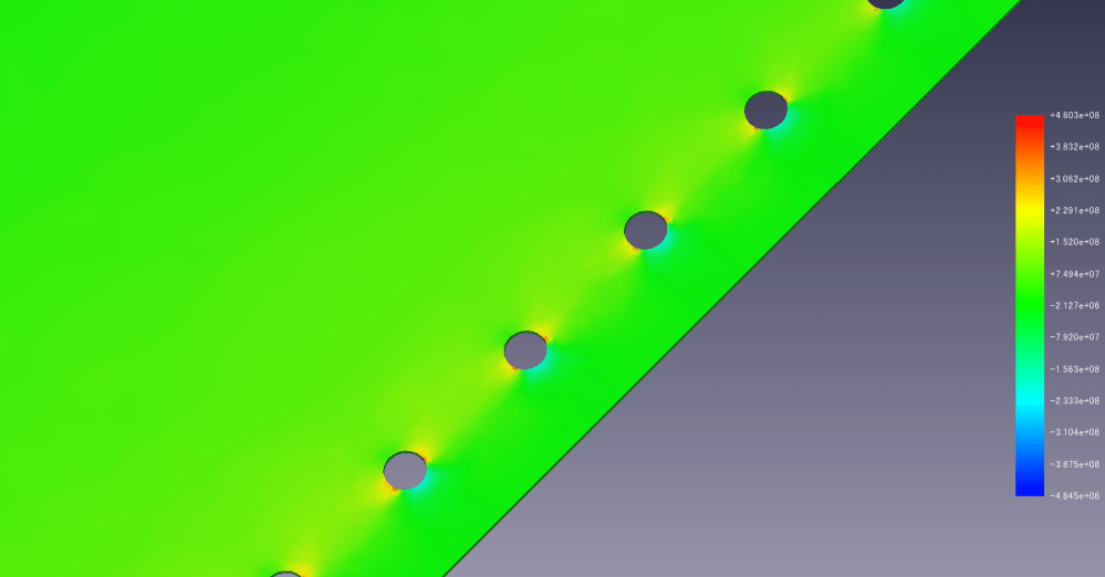 この流れの様子から分かることは上流側応力は穴によりせき止められ、その分の穴の脇を抜けていきます。そしてその脇に抜ける量が円の直径に対して約1/3位に見て取れます。このため印加した応力85MPaの約3倍の応力が円の縁に加わっていると考えられます。