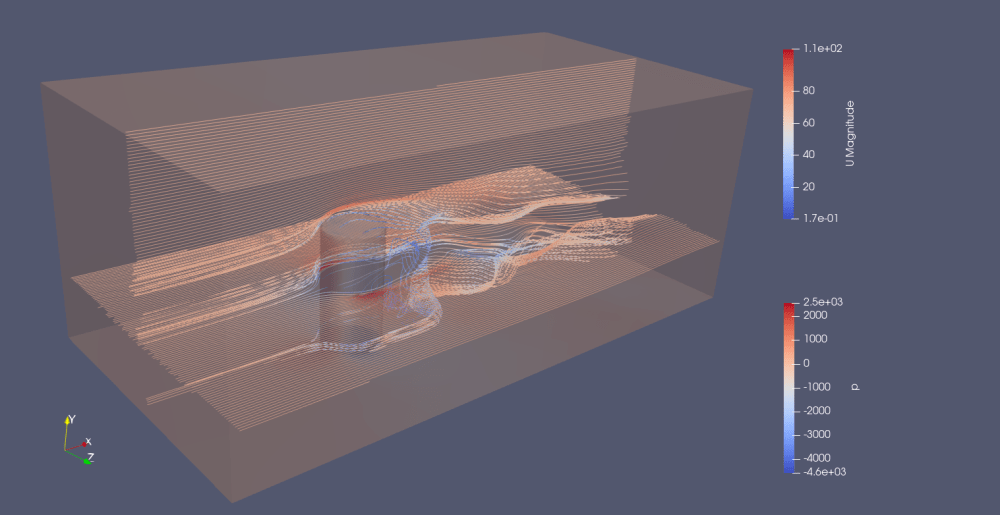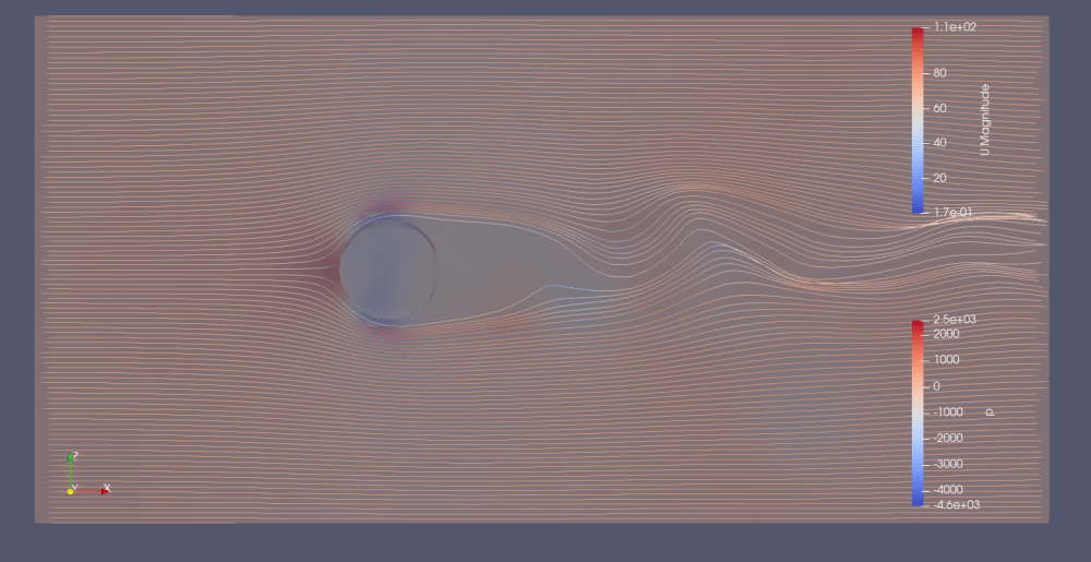 周囲速度70m/sは円柱を迂回する際に107m/s(線)まで増速しています。圧力は円柱表側で+2500Pa(半透明直方体)まで増圧されます。これは動圧分0.5*702=2450Paとほぼ一致します。一方円柱側面では-4500Paまで減圧されていますが、動圧分0.5*(1072-702)=3270Paとかなりずれています。このあたりは以下の2点が主な原因と思われます。