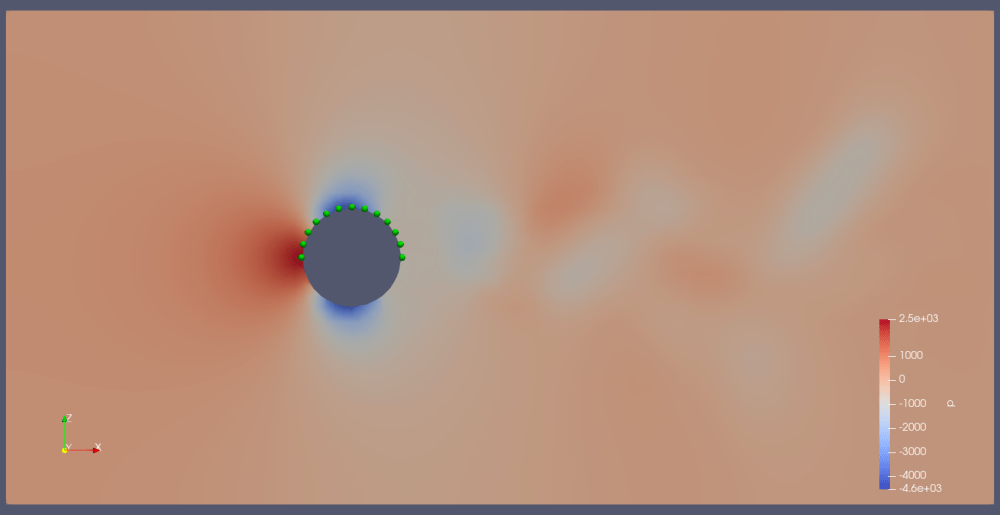 (上記カルマン渦の公式に使用している0.2という数字はストロ-ハル数と呼ばれており、レイノルズ数2x105までの速度(4m/s)に対応しているそうです。このため今回のような速度(70m/s)には対応できていなさそうです。もう少し詳しく検討した2D円柱周りの解析をこちらに示します。)