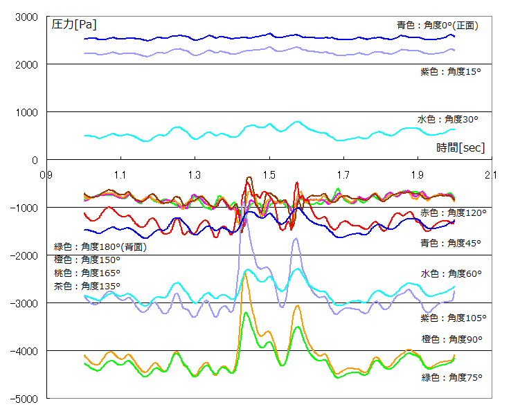 角度0°の正面では約2500Paの正圧が立っており、70m/sの動圧分と一致してます。