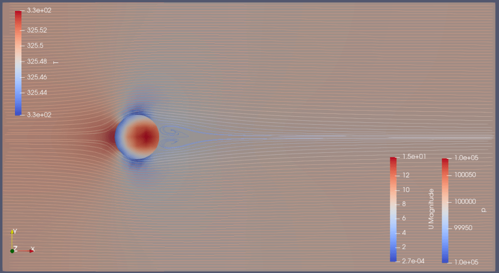 ・円柱後方に渦が見て取れる。但しカルマン渦列までは成長していない
