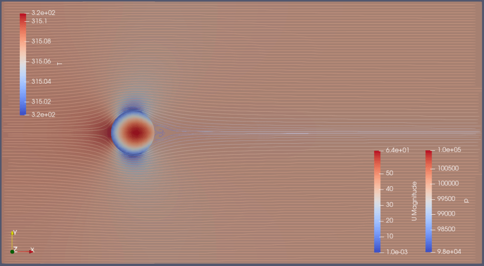 ・円柱解析で示した通り、レイノルズ数2e+5以下ではカルマン渦列が円柱後方に発生します。しかしpimpleFoamのRASモデルでは発生していません。剥離点が円柱背面側まで移動しており、あたかも超臨界領域の挙動を示しています。