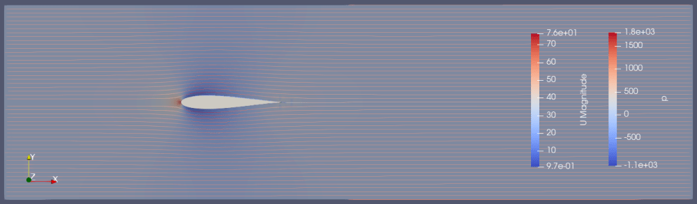 周囲速度60m/sは翼を迂回する際に76m/s(線)まで増速しています。一方圧力は-1112Pa(背景)まで減圧されています。この減圧分は速度増速分1088Pa(=0.5*(762-602)とほぼ一致します。尚非圧縮の場合、OpenFoamでは密度1として計算されているそうです。