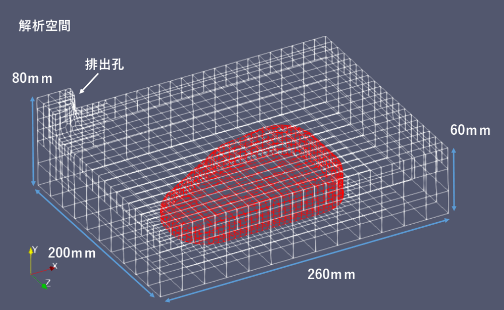 ・解析空間底面の蒸気の初速を0.1[m/s]に設定。出口を除き、他の面は0[m/s]に固定。出口は計算任せ。