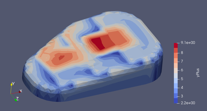 ・壁関数の計算結果は下図(最大9.1、最小2.2)でこれもRASの適切範囲(30~1000)の領域外でした。