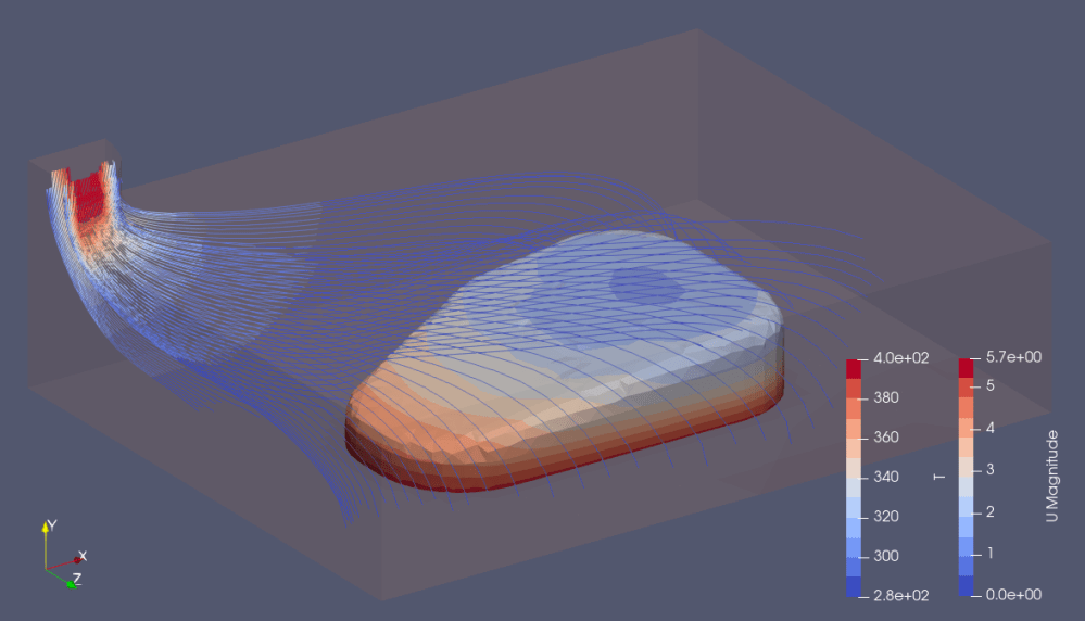 肉表面は温度を、壁は中央断面温度をずらして表示しました。 また流線は速度を示しています。
