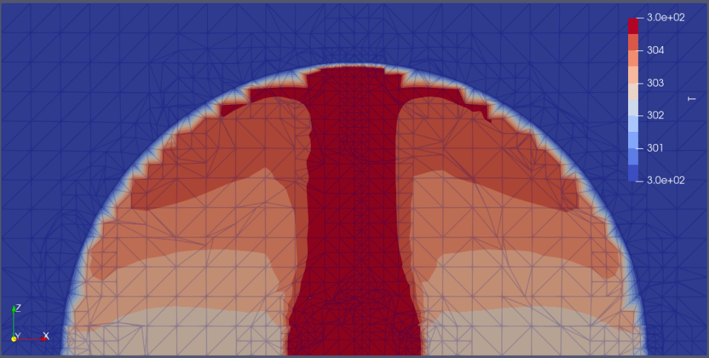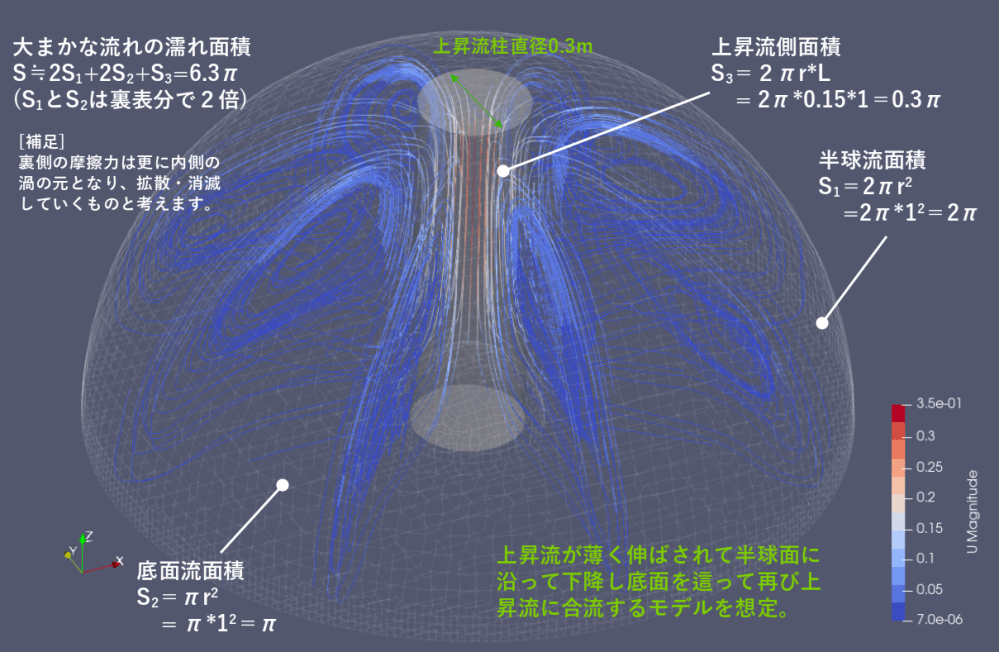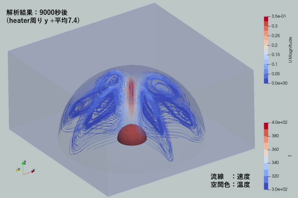 ・上昇流は頂上に達した後、半球面を下り底面を這う。その後heater表面にそって昇り、上昇流と合流する。