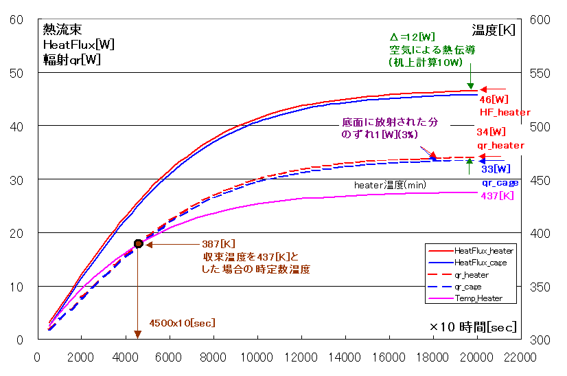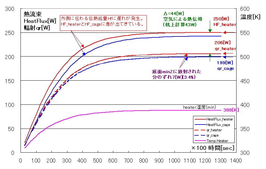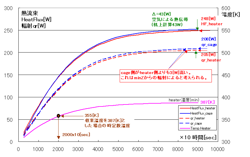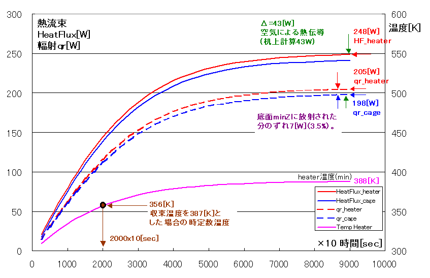 尚cage輻射量qrが197[W]でheater輻射量qr205[W]よりも収束近傍で7[W](4%)少なくなっています。