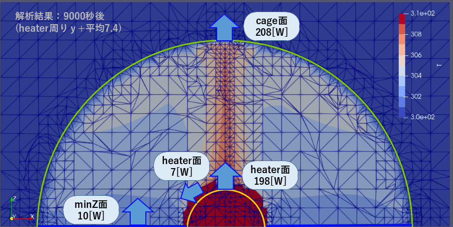 ・heaterの底面に定常250[W]を印加、cageの外面はすべて300[K](約30℃)で固定、airの底面はzerogradientで定義