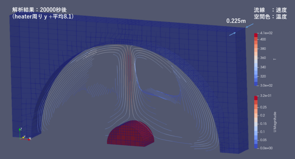 OpenFoamの計算結果は1.3項より最大0.35[m/s]、全域0.1[m/s]で概略推算値0.39[m/s]はオーダーとして一致していると考えます。