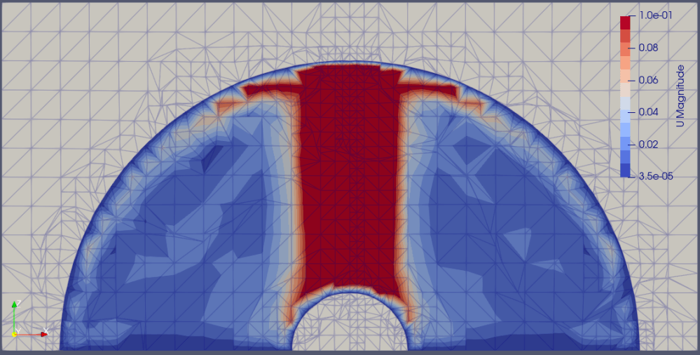 ・半円まわりのメッシュ粗さはrefinementSurfaces level(1 2)に設定(基本メッシュの21~22に分割)。