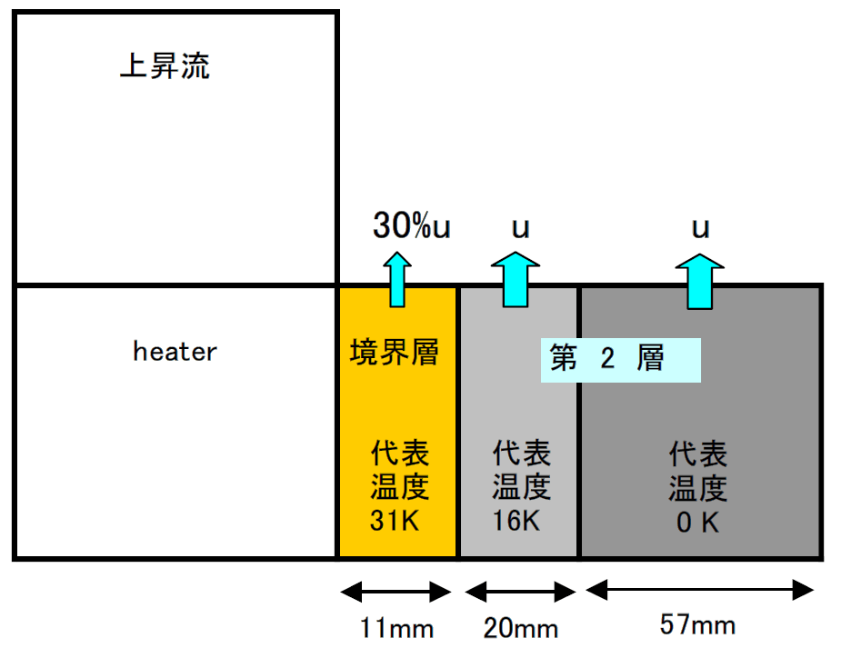 ・heater表面に沿って上昇する間にheaterから加熱される。この際、境界層を表現するためにこの流れを2層に分ける