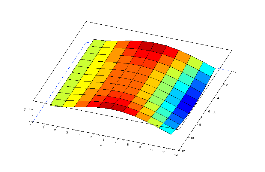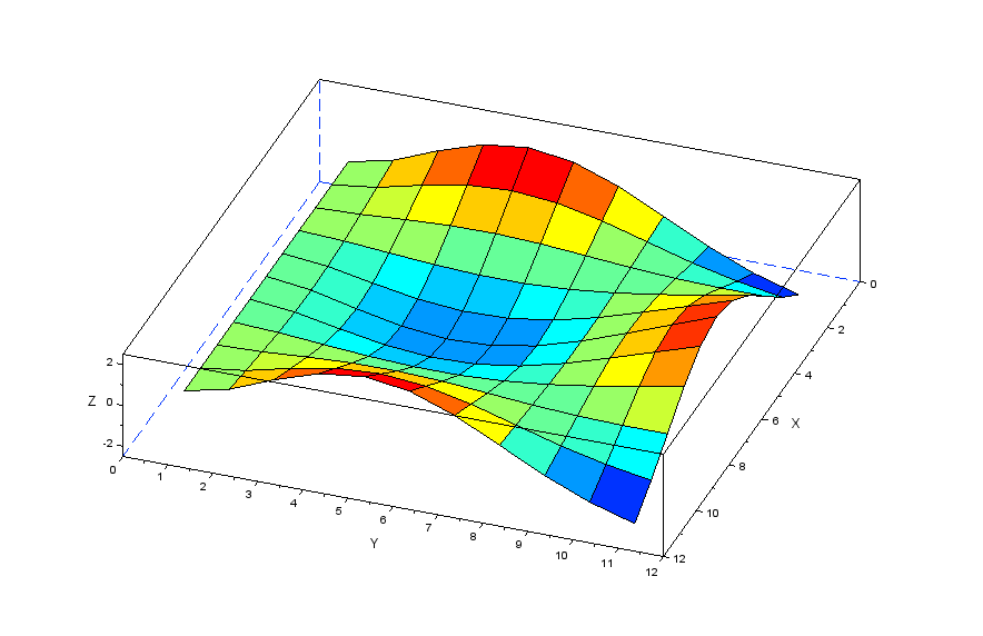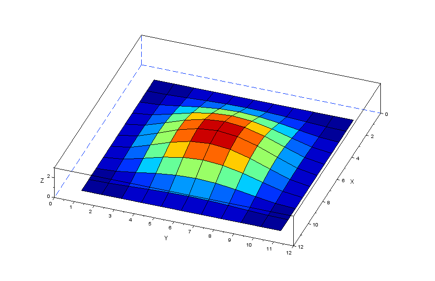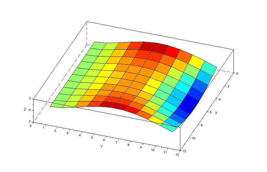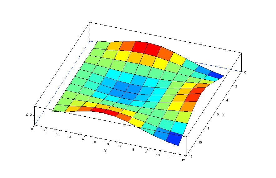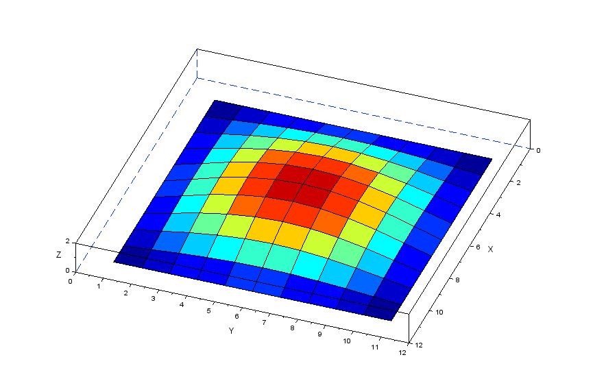 更に張力の分力を表現する行列[Nstr]を作成することで以下のscilabモデルにより膜モデルの振動を解析してみます。