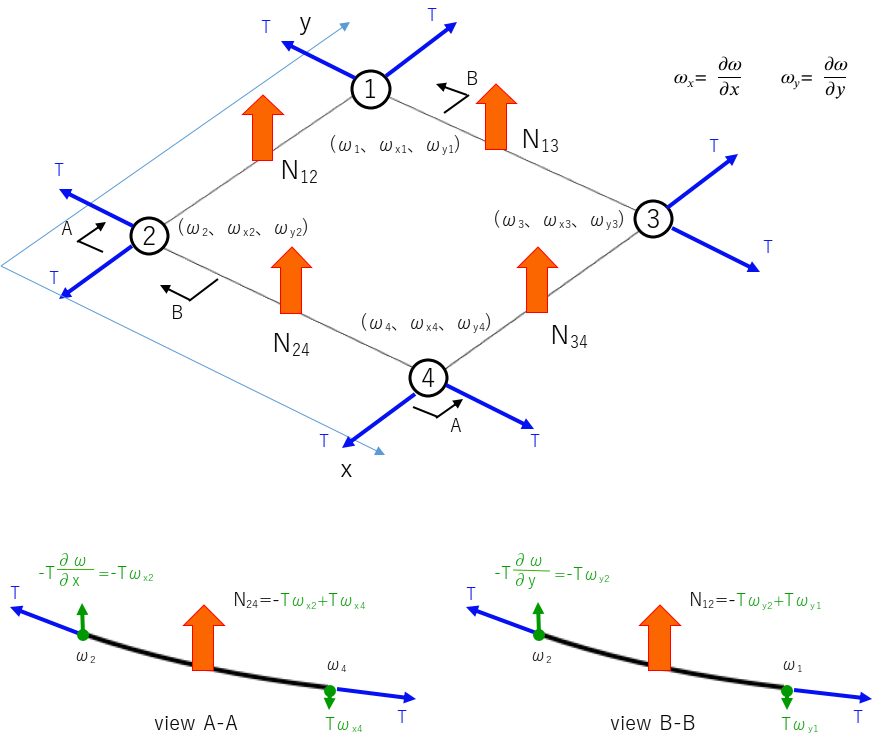 下図のように張力Tの分力が膜要素のz方向運動を担います。