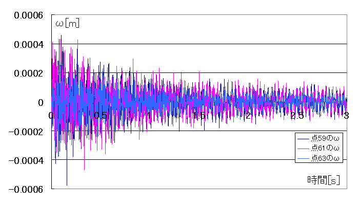 計算結果の代表として節点59、61、63の動きを以下に示します。減衰力のおかげて不必要な高周波成分がカットされていきます。