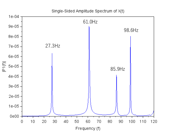 FFT結果から27.3Hzと61.0Hz、85.9Hz、98.6Hzに大きなピークが出来ています。
