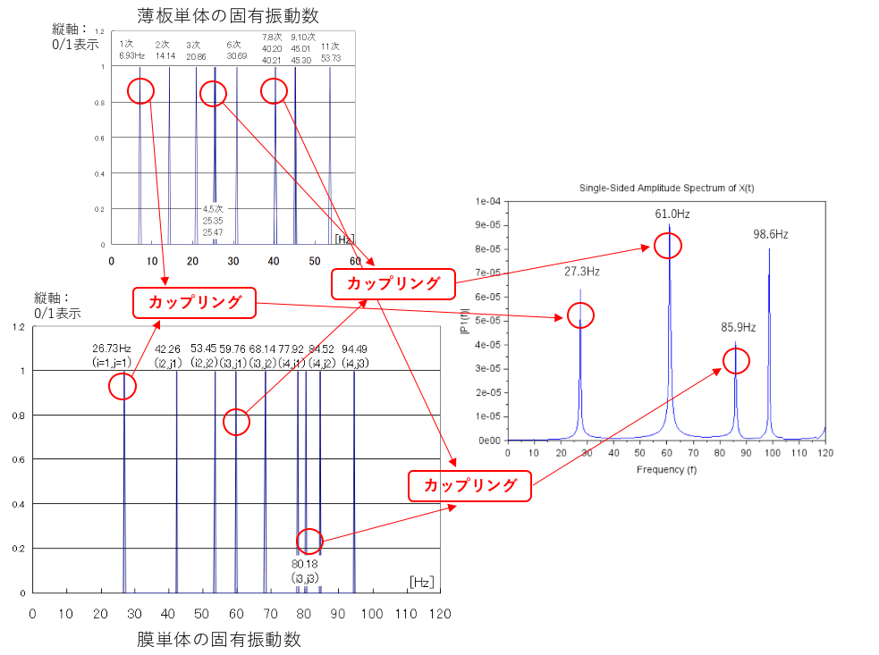 結果、薄板の固有モードと張力による膜のモードがカップリングして新しい固有振動数のモードになる様子が見て取れます。なおこの結果は中心点61でのカップリングであり、他の点では別のカップリングが起きていることを確認しました。非常に複雑に絡み合っています。