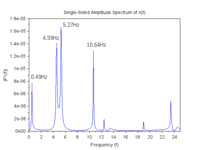 FFT結果から0.49Hzと4.59Hz、5.27Hz、10.64Hzに大きなピークが出来ています。