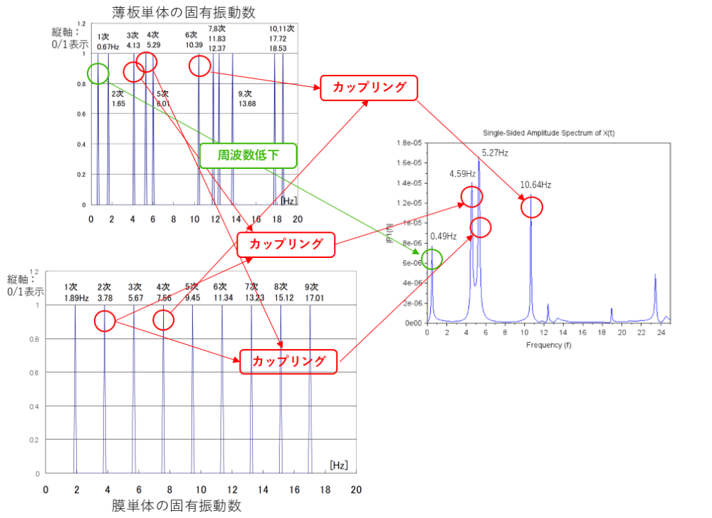 尚薄板の運動に下図のような張力を入れ込む解析方法は当事業所オリジナルアイデアのため検証が重要となります。