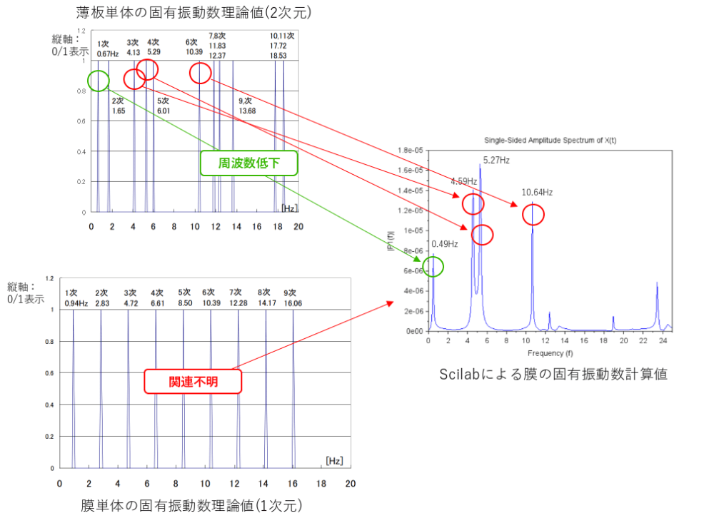 2次元の薄板固有モードと1次元の膜固有モードのカップリングは形状の一致をくみ取れず、明確化できませんでした。